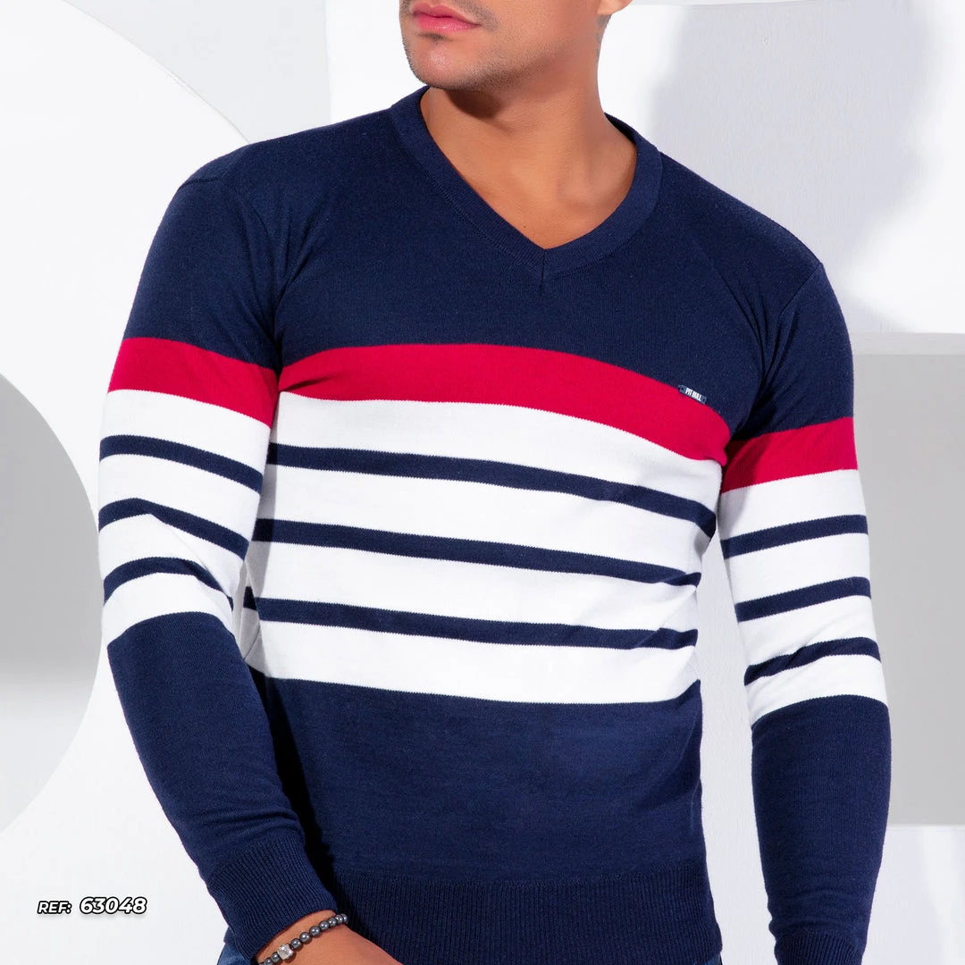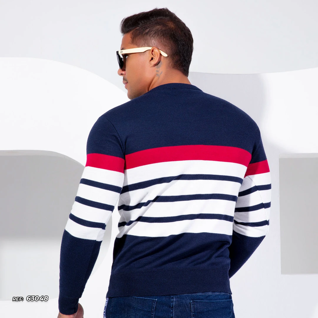 Detail: V-neck t-shirt, made in tricot, which brings total comfort to your daily life. The piece has a striped print with red and white cutouts and custom trim with logomania. Its super-soft fabric offers a light touch to the skin, warming on cold days.