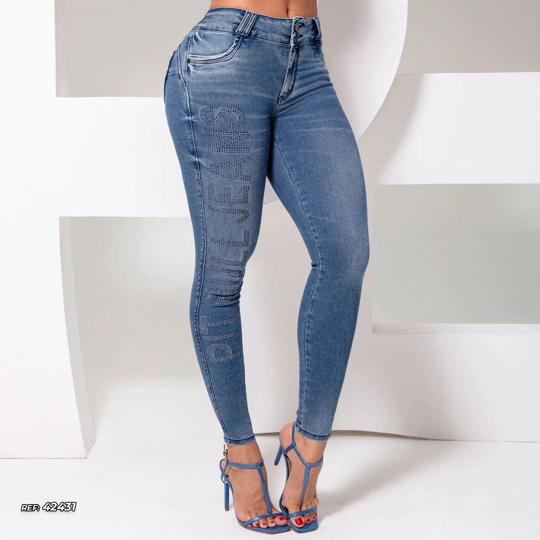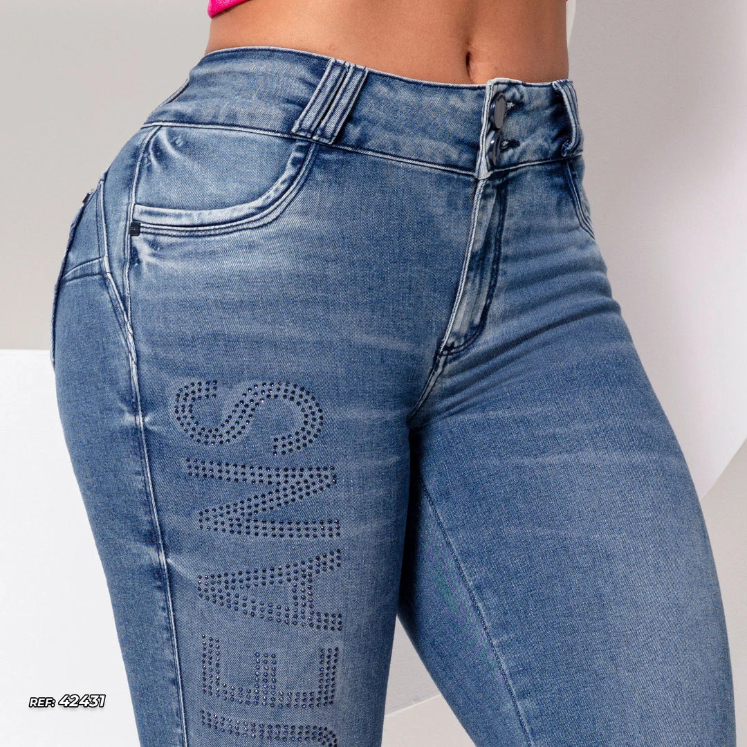 Details: Sexy skinny modeling jeans, tight to the body, washed in medium tone with vintage markings, personalized with Pit Bull logo on the side in blue gemstones, produced in jeans fabric with spandex providing high elasticity and free movement, heart flap and Removable inner bulge for lifting butt effect, trims in blue metals.