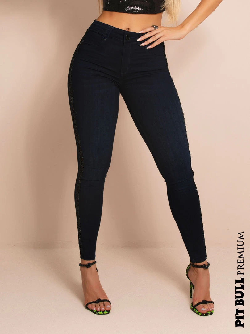 Skinny Jeans with technological wash in dark blue that does not fade, lifts butt that values ??all the curves and gemstones bathed one by one in graphite and hand embroidered in the model that is ideal for putting together powerful looks!