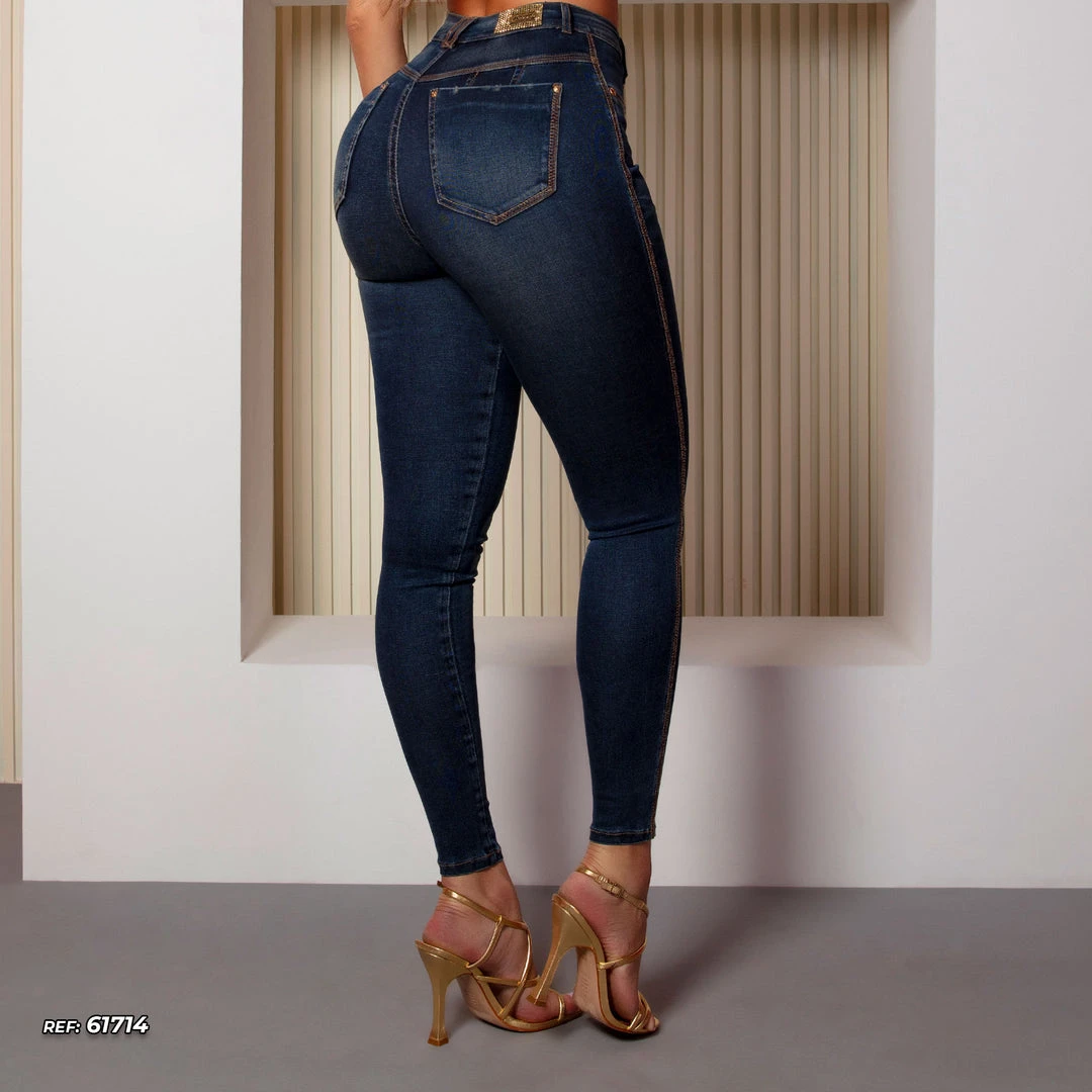 Details: skinny jeans with an internal shaping belt that reduces waist measurements giving an instant lipo effect. The piece has a high waistband, laser wash that does not fade and a removable inner cup for a butt lift effect. Customized trims with logomania.