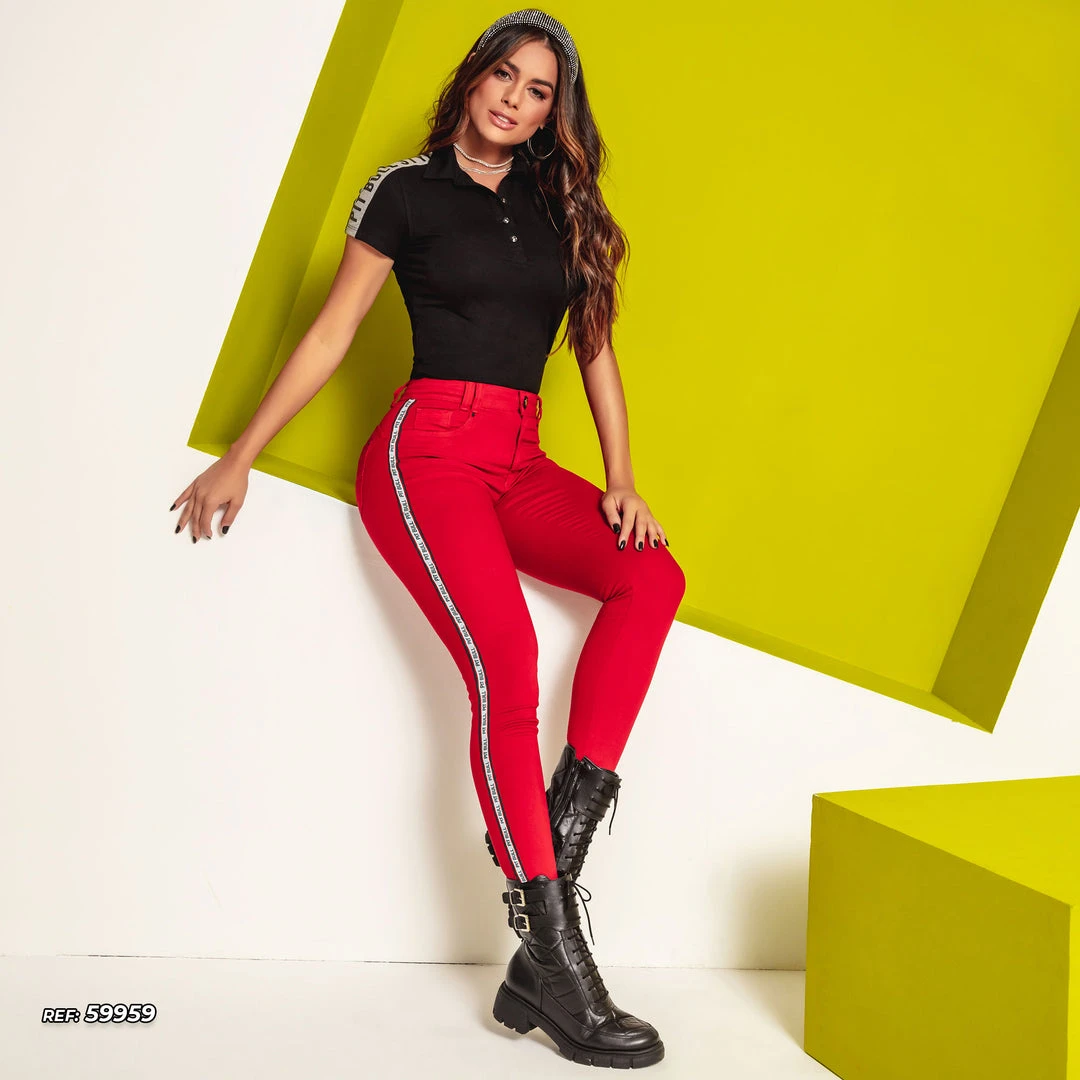 Details: Pants produced in highly elastic denim fabric, washed in red with technology that does not fade the color, skinny modeling that shapes the body and enhances curves, high waist, cutout details on the side with Pit Bull Jeans logomania, straight peak and removable inner bulge for rearing butt effect and trims in black metals.