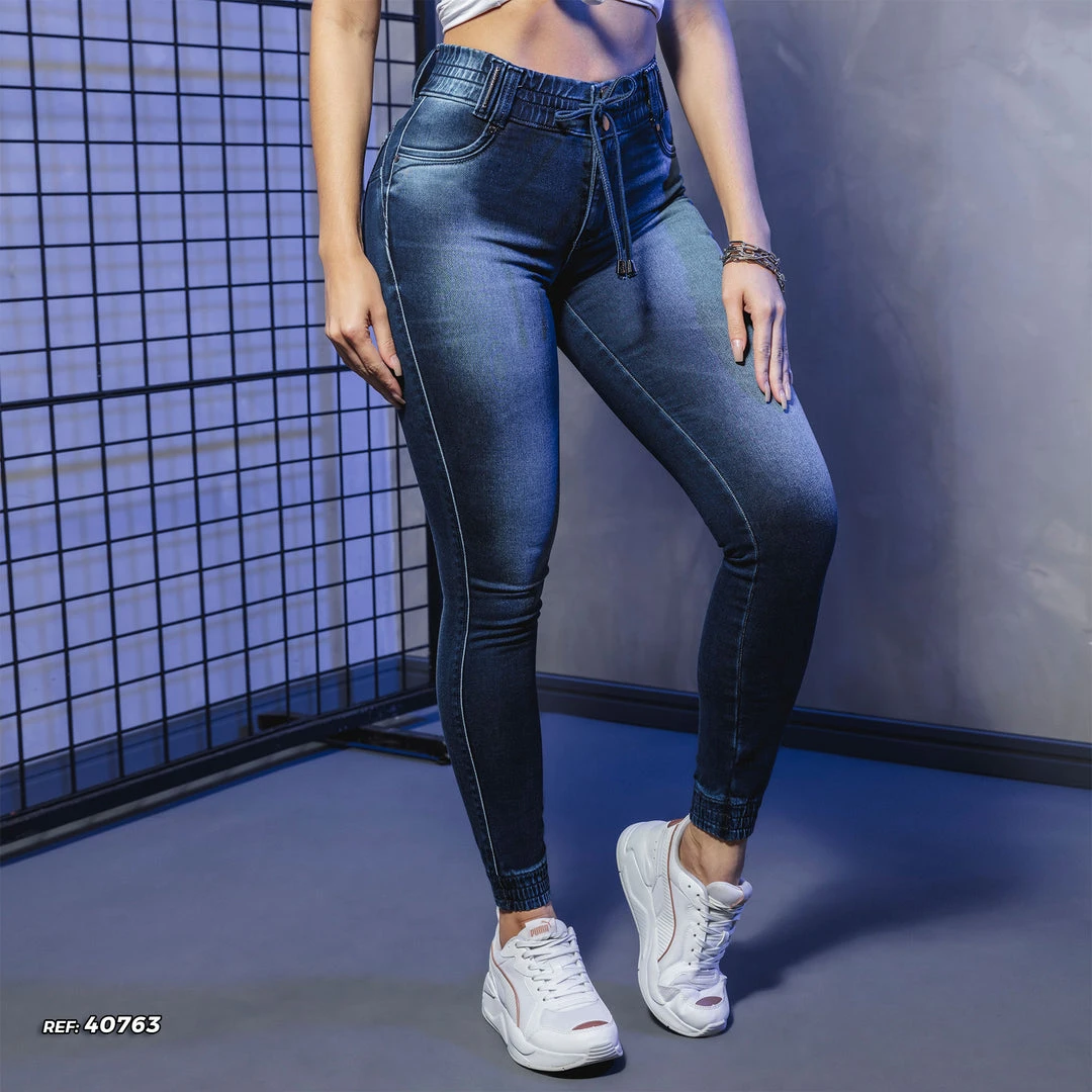 Details: women’s jeans jogger that enhance the body and feminine curves, technological wash in a medium blue tone that prevents fading, comfortable fabric with elastane, custom trims in graphite metal, adjustable waistband and cuffs with built-in elastic, heart model and removable inner cup for push-up effect.