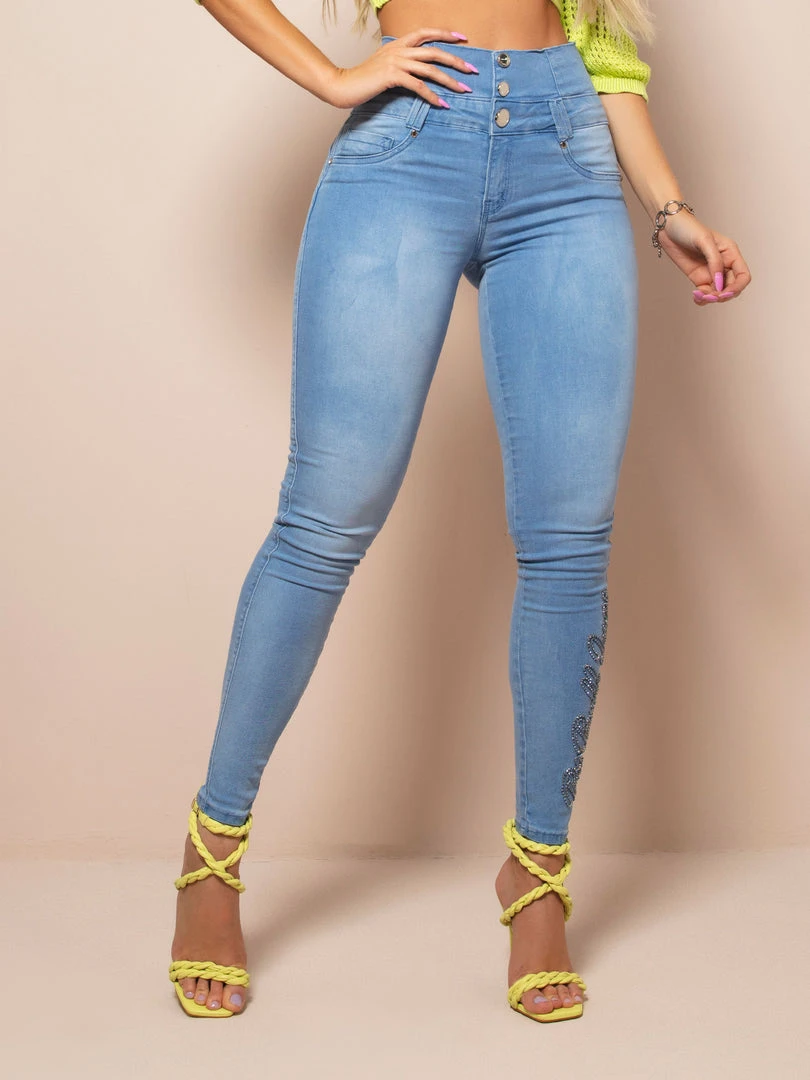 Details: Jeans with skinny modeling in high-elastic technological fabric. It has double elastic in the waistband and shaping adjustment in the waist with zipper and elastic, providing the option of adjustment according to who wears the model. To complement the perfect modeling, the piece has a removable inner cup that increases the size of the butt by up to three centimeters. It’s the real butt lift! The personality of the look is guaranteed by the light blue wash with details of used light points and the hand-stitched embossed logomania.