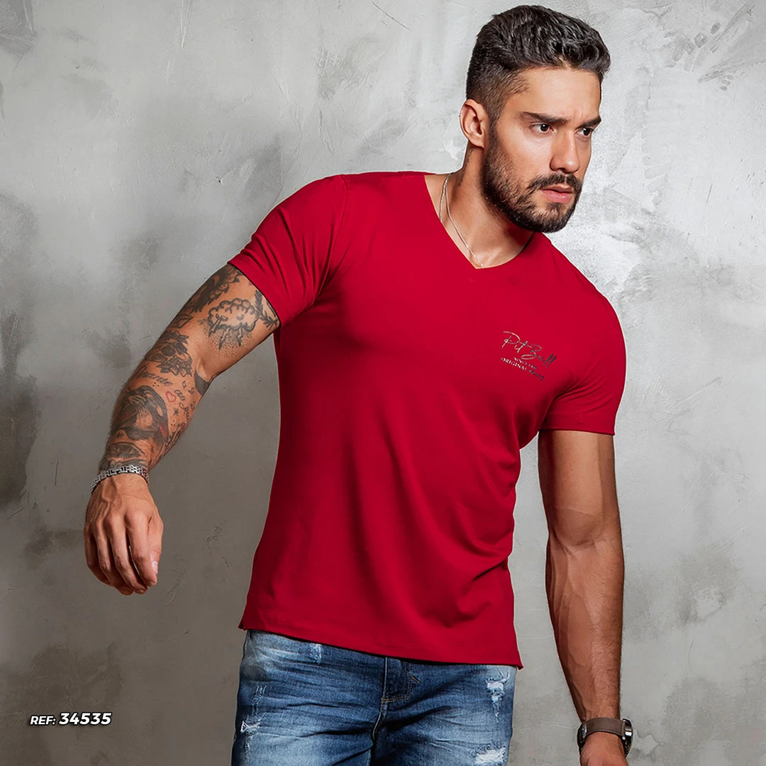 Basic V-neck t-shirt with embossed metallic print logo.