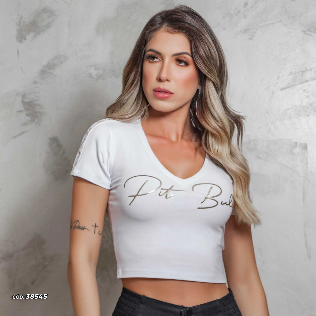 Baby look in mesh with good elasticity, silk in golden foil and cut out on the shoulders.