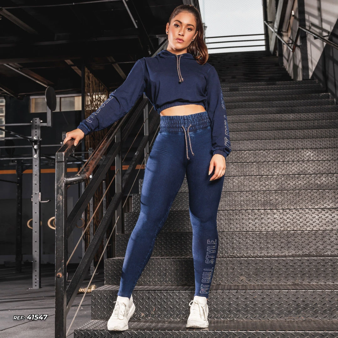 Details: Dark blue legging pants, with elastic waistband and pleated effect with tie at the waist, produced in denim mesh with elastane, high compression fabric and personalization in Pit Bull logomania with rhinestones on the side.