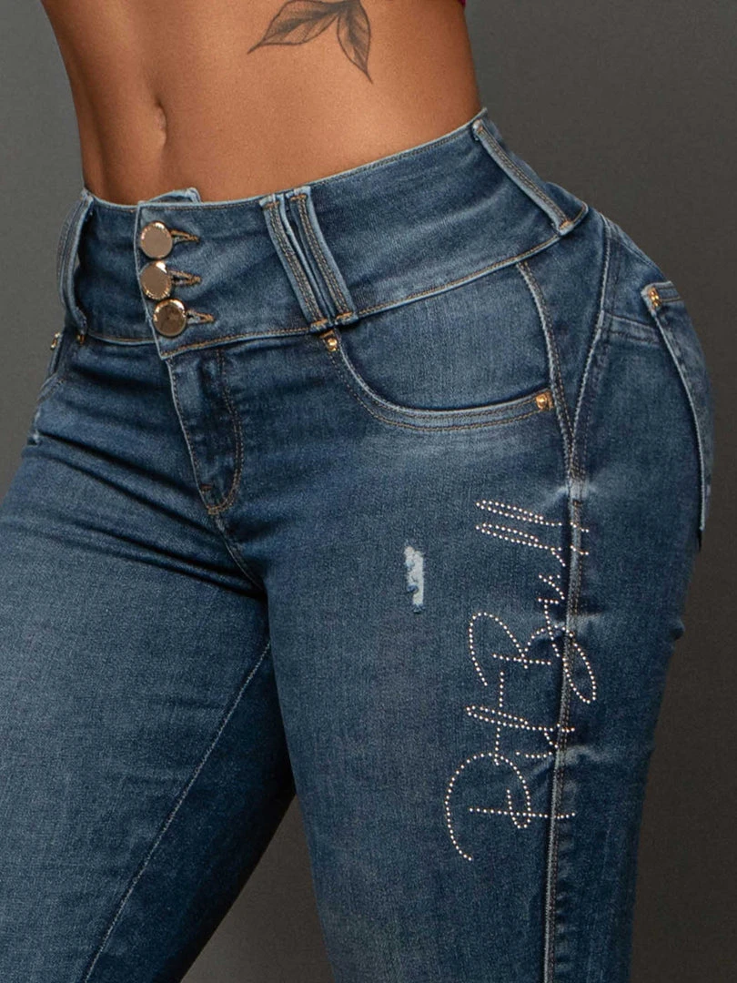 Details: skinny pants, capri model that elongates the silhouette and brings more style to the look. The piece has logomania details in rhinestones on the side, a technological laser wash that prevents fading, personalized trims with logomania and a removable inner cup for the butt lift effect.