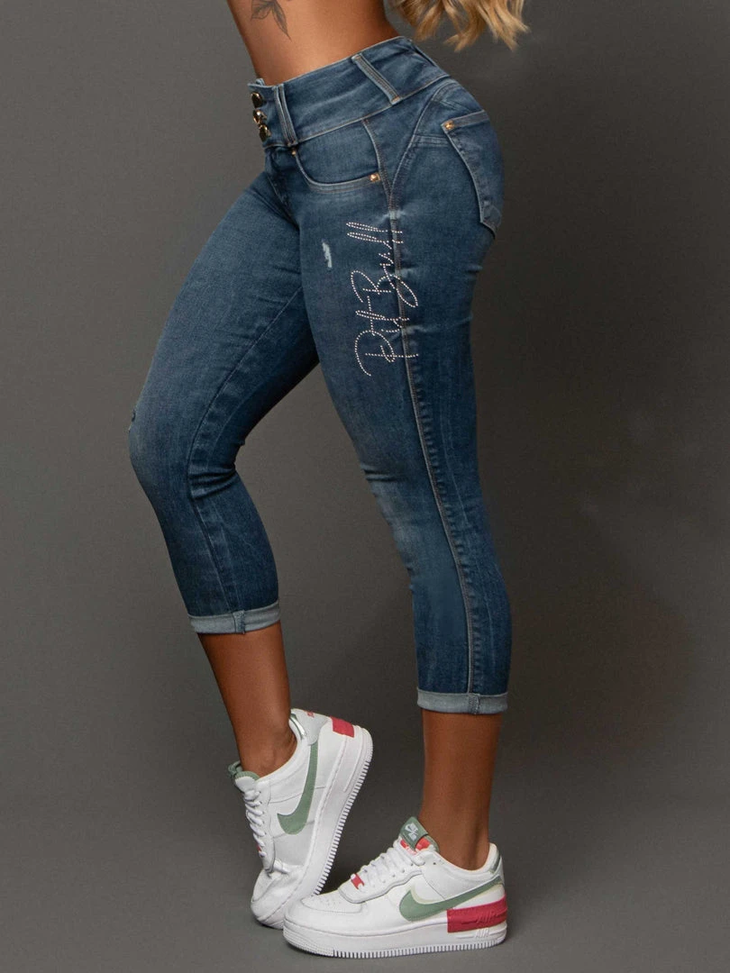 Capri pants are the ideal choice for women who want to lengthen their silhouette and enhance their curves! Skinny model with a shorter hem, rhinestone logomania on the side and butt lift technology that enhances your curves!