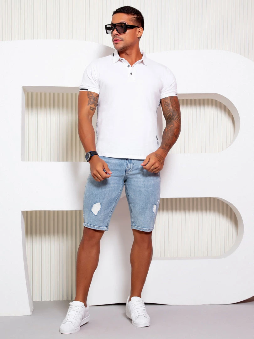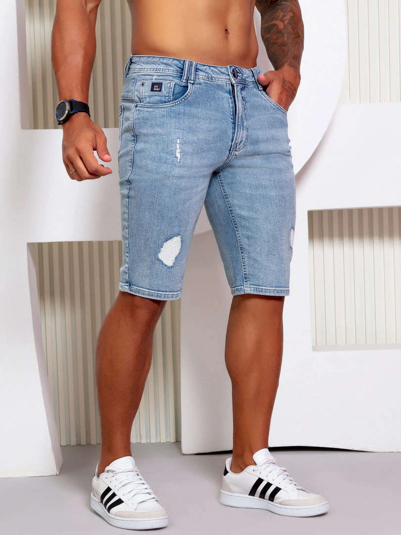 Details: men’s denim shorts, made in light fabric, with a perfect fit on the body. The piece has destroyed details for more style and custom trims with logomania.