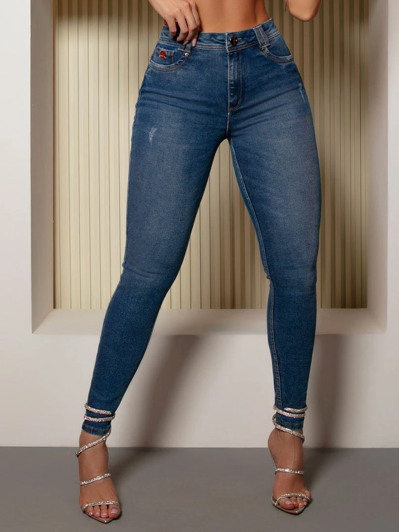Details: fitted jeans with super high waistband that shapes the waist. The piece has a removable inner cup for a butt lift effect, frayed details and technological washing that prevents fading.