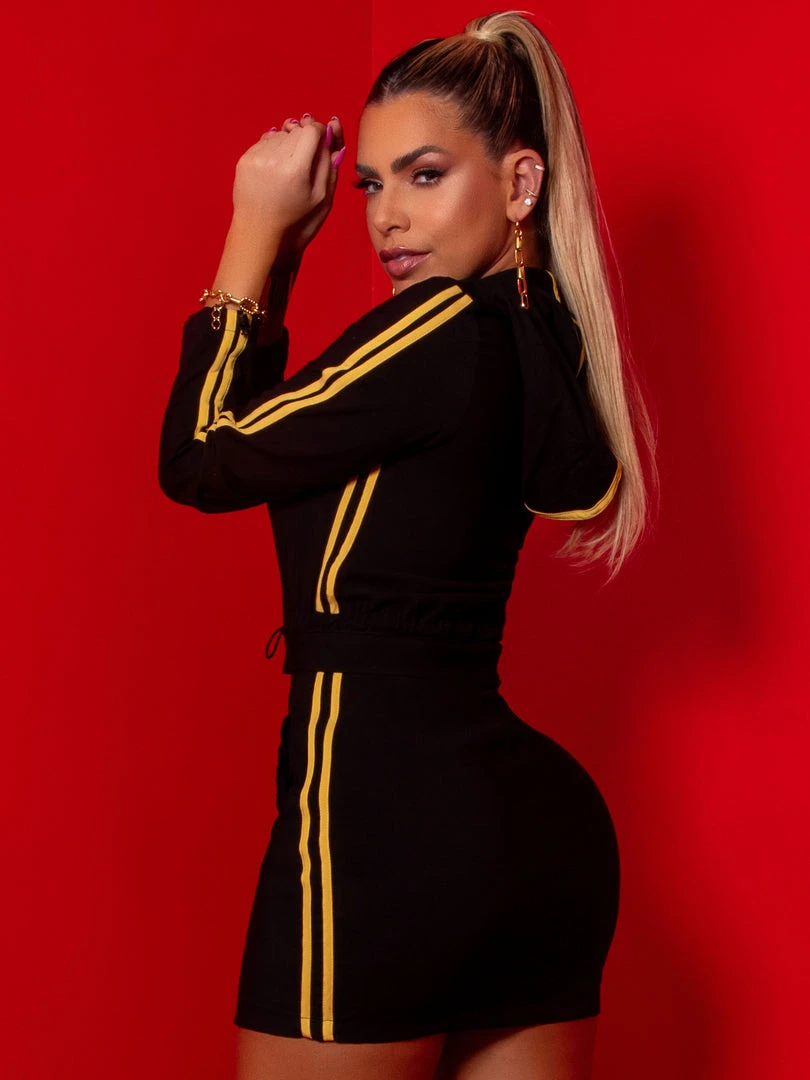 Details: parka dress made in a looser model. The piece has a hood and side stripes for more style. Plus, with a hidden zipper, the dress forms a T-shirt and skirt that can be worn separately.