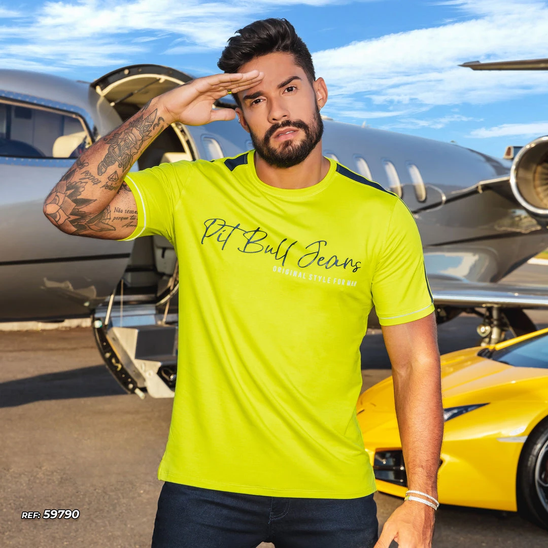 Details: Lime green O-neck shirt, short sleeves, produced in viscose mesh with elastane, with details in Pit Bull logo and lively cutouts, model that fits the body.