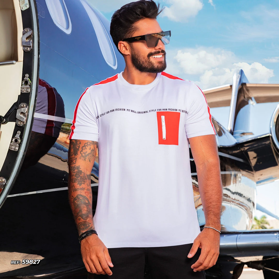 Details: Men’s white collar t-shirt with orange detailing, Pit Bull Jeans logo on the front, produced in mesh with high elasticity providing greater comfort, straight modeling, personalization with a tractored zipper front pocket.