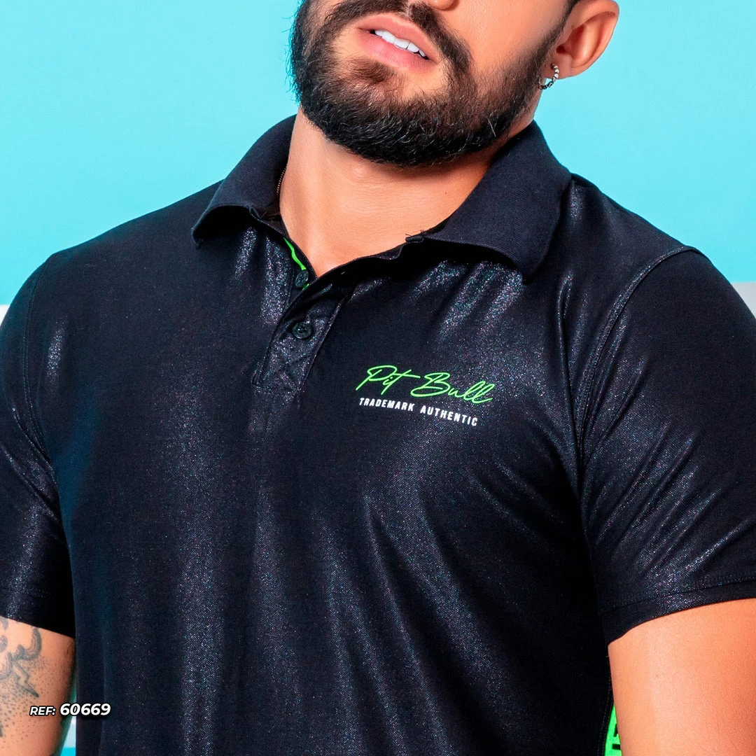 Details: black polo shirt produced in mesh with high elasticity and light shine providing greater comfort, personalization in neon and white cutouts on the sides with Pit Bull Jeans logomania, front buttoning, straight modeling and short sleeves.