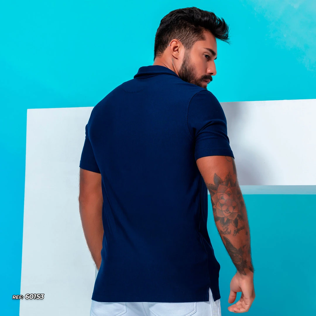 Details: short-sleeved polo collar t-shirt with white embossed logo.