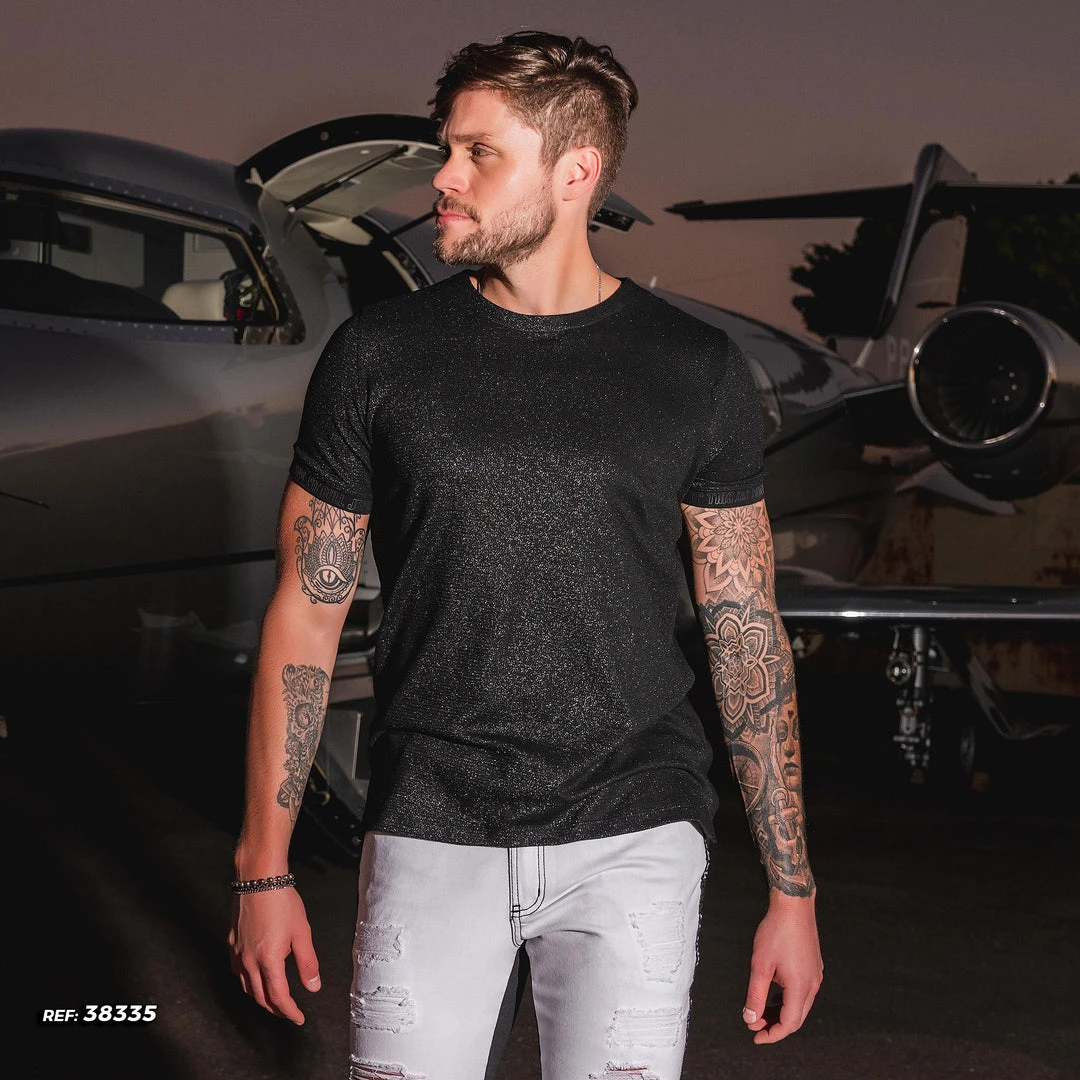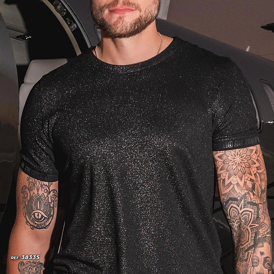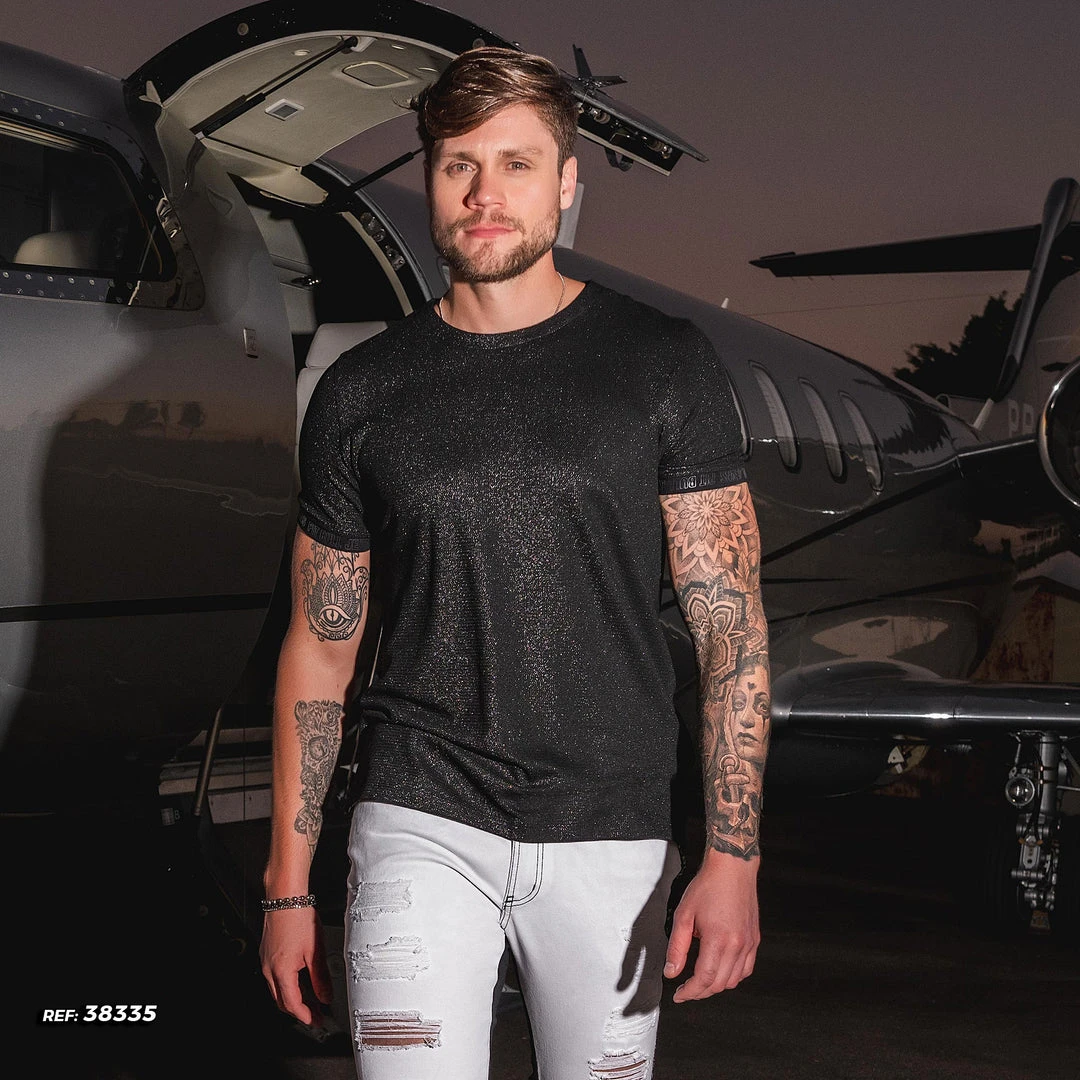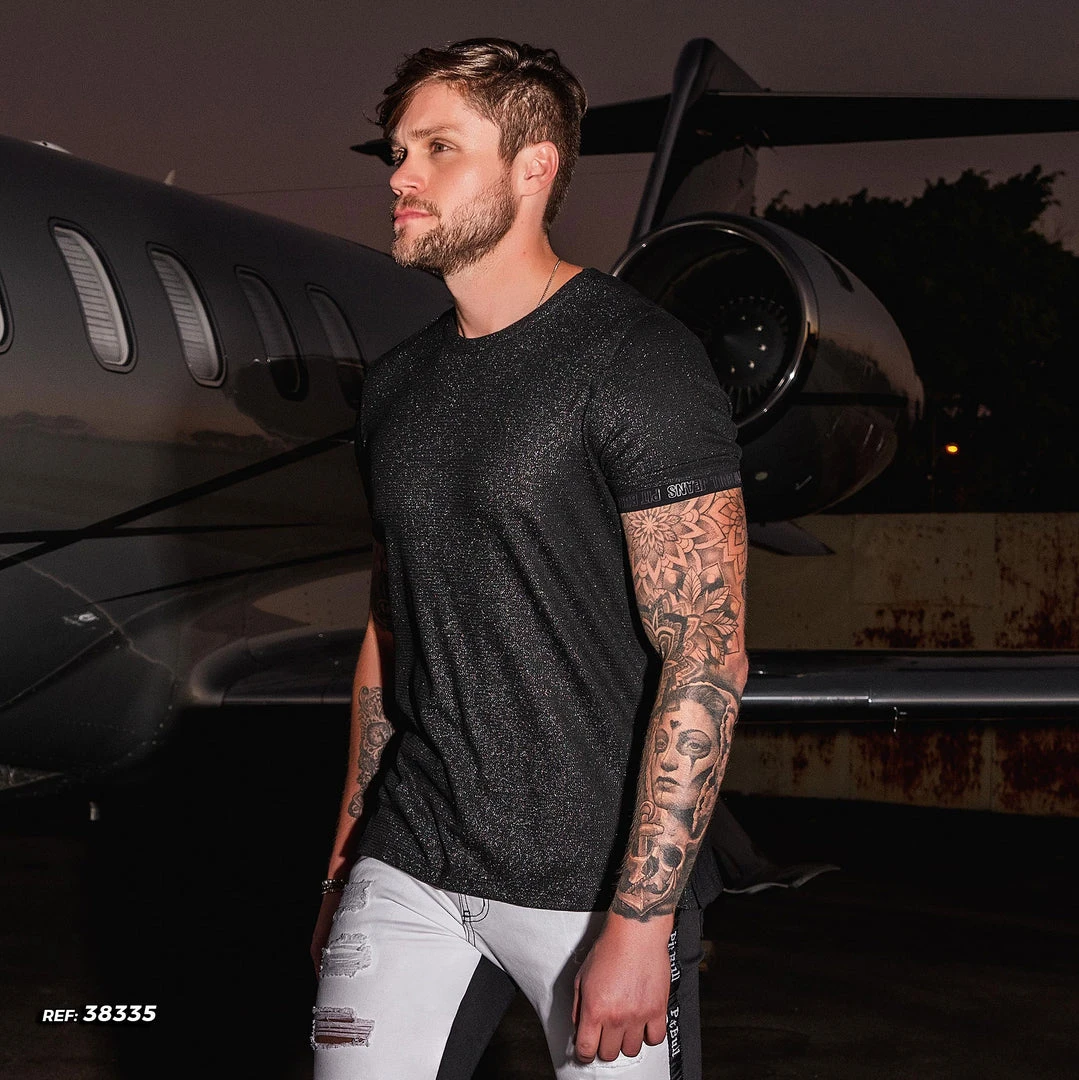 O-neck t-shirt, short sleeve. Mesh front and sleeves with black lurex. Details of stamping logomania on the cuffs.