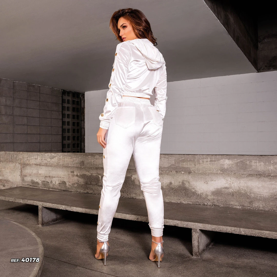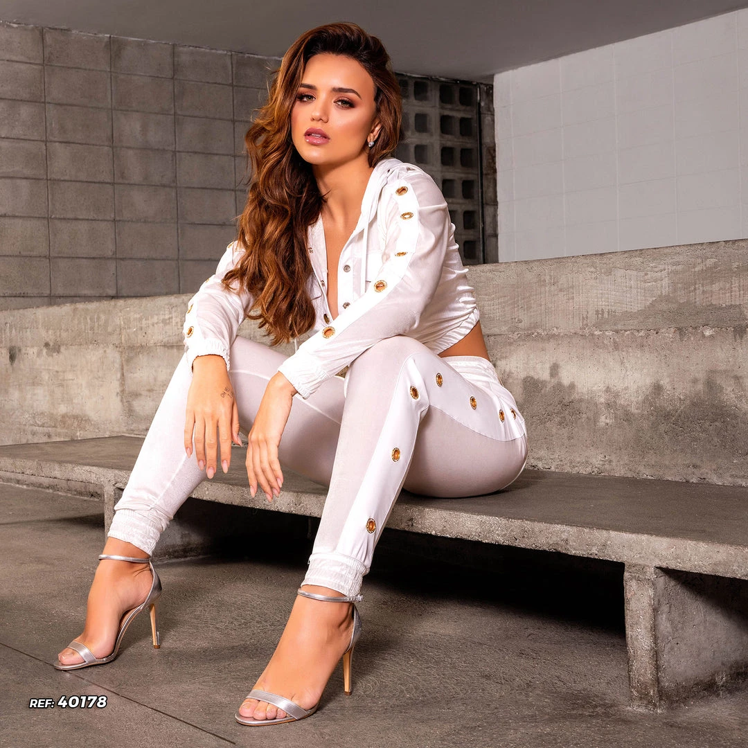 Female jogger pants produced in high standard knitwear, with elasticity, velvety touch and light natural shine effect, due to its composition. The piece is perfectly shaped, with a stripped touch, with elastic on the cuffs and waistband. It has a removable internal cup, causing an incredible “butt kick” effect. The personalized arrangement is in golden color with rhinestone details and exclusive pit bull jeans.