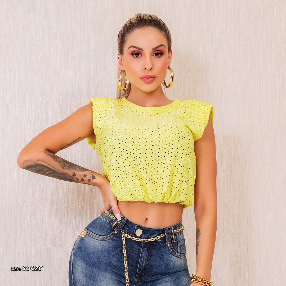 Details: Women’s sleeve cropped top, produced in light and comfortable mesh. Cropped muscle tee in laise mesh with elasticity and light transparency due to the opening in the design of the mesh, workers for structuring, application of rhinestones and adjustment to adjust the bar.