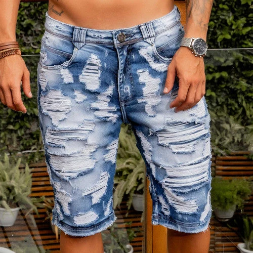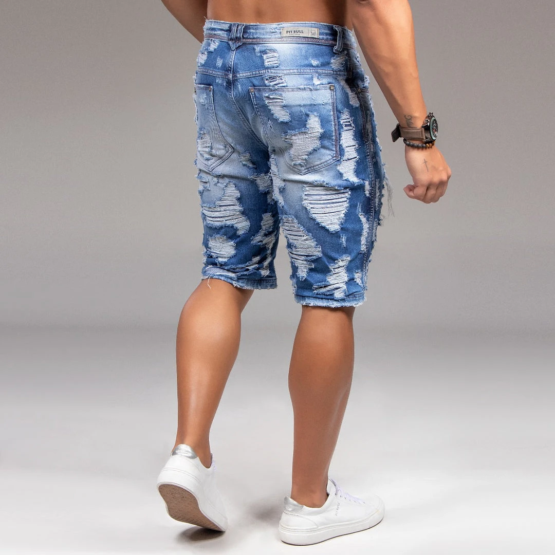 Men’s denim shorts, total with rips destroyed. Model stripped and stoned both in front and back.