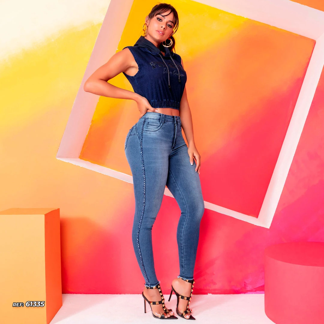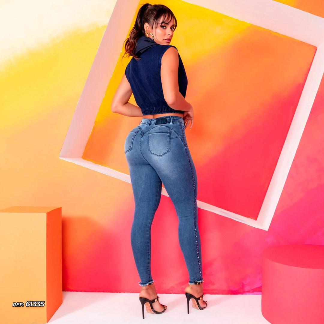 Details: Medium blue skinny pants with technological laser washing that prevents the garment from fading, its frayed hem and the personalized side with rhinestones bring all style to your daily life. Personalized design with logomania and heart flap that promotes the “push-up” effect.