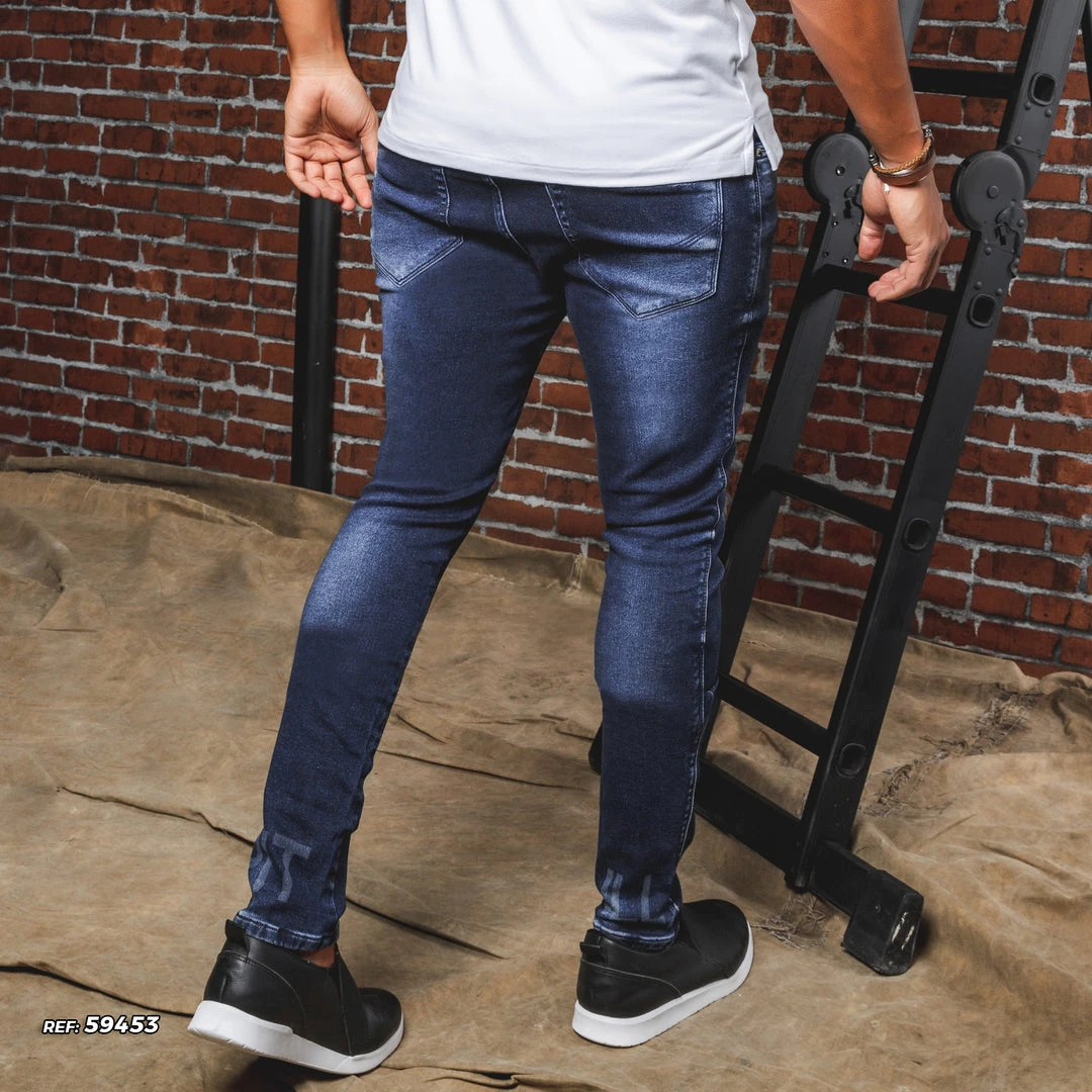 Men’s denim pants slim that fit the body without squeezing, soft fabric with elastane for greater comfort, medium blue technological wash with laser details that prevent fading, custom trims in silver metal and functional pockets.