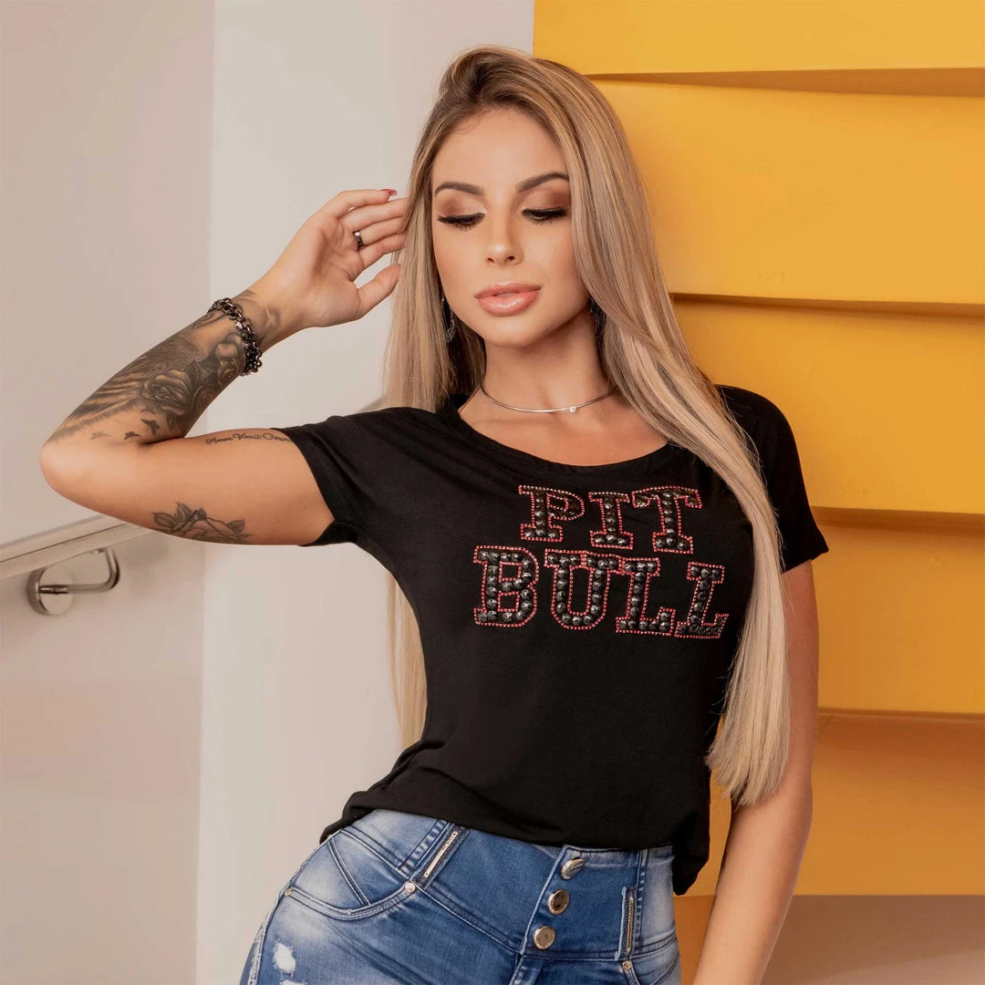 Women’s knitted t-shirt with elastane. Pit Bull manual embroidery in rhinestones and stones.